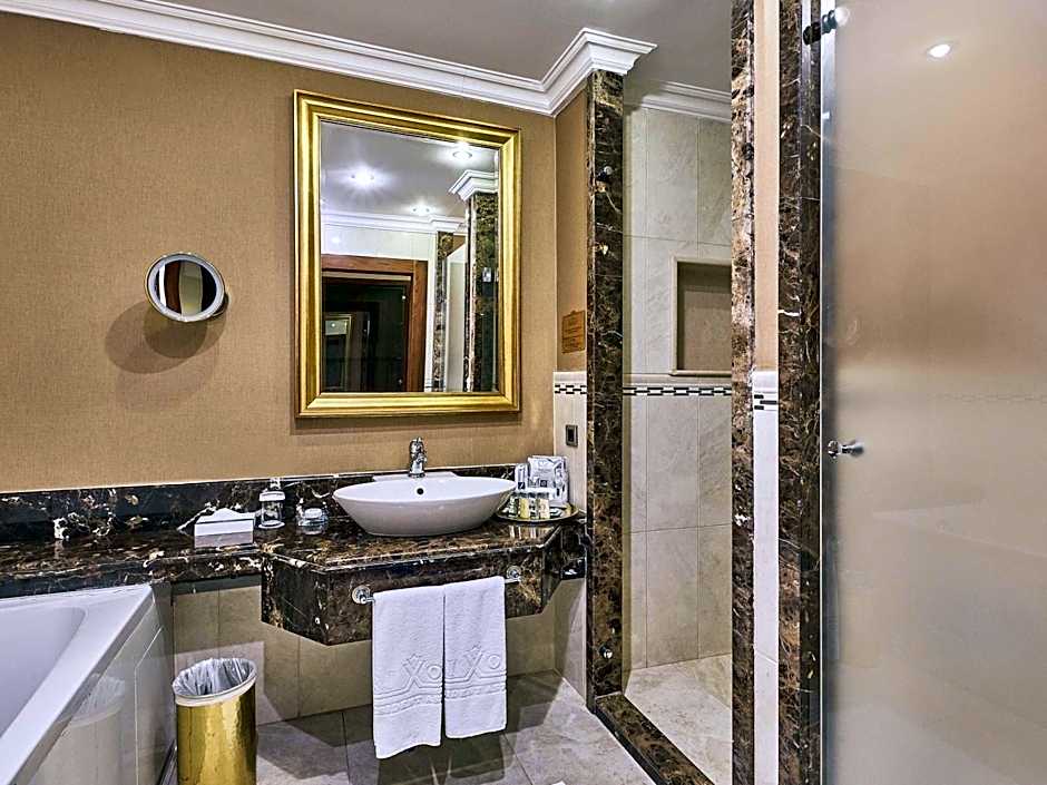 Guests will have a special experience as the suite offers a fireplace. The spacious suite provides air conditioning, a mini-bar, as well as a private bathroom featuring a bath and a shower. The suite features parquet floors, a seating area with a flat-screen TV, a tea and coffee maker, a wardrobe as well as city views.
