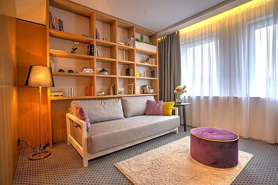The room has a sitting area with a sofa and a dining area. The room is complete with a private bathroom with free toiletries.