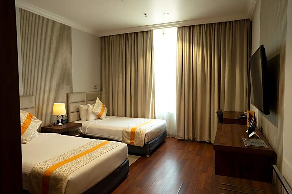 A air-conditioned spacious 30 sqm room overlooks the gulf road. It includes 2 single beds, a large reading desk, a mini-bar, a 50" flat-screen TV, ironing facilities and tea/coffee making facilities. Each bathroom includes free toiletries.