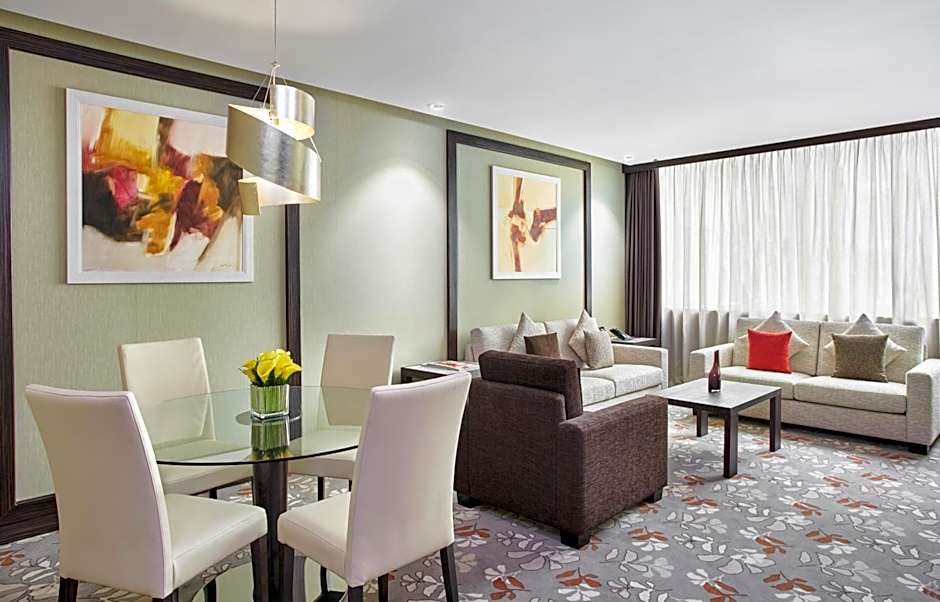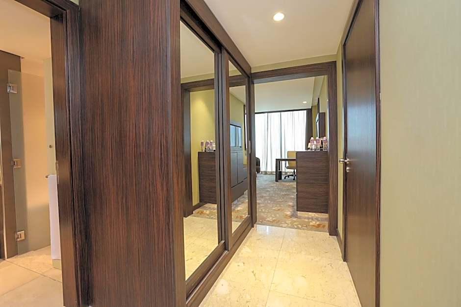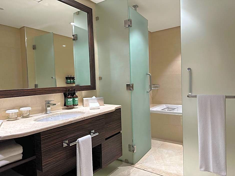 The spacious suite provides air conditioning, soundproof walls, as well as a private bathroom featuring a walk-in shower and a bath. The suite features carpeted floors, a seating area with a flat-screen TV with cable channels, a mini-bar, a tea and coffee maker, as well as executive lounge access. The unit offers 1 bed.