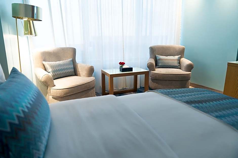 The Symphony Style Hotel Kuwait offers a variety of room types, including Double and Twin rooms, as well as Suites. All rooms are non-smoking and have a room size of 377 sqft. The Double rooms accommodate 2 adults and 2 children, while the Suites can accommodate between 3 to 4 adults and 2 to 3 children. The beds in the rooms consist of either 1 King size bed or 2 Twin beds.