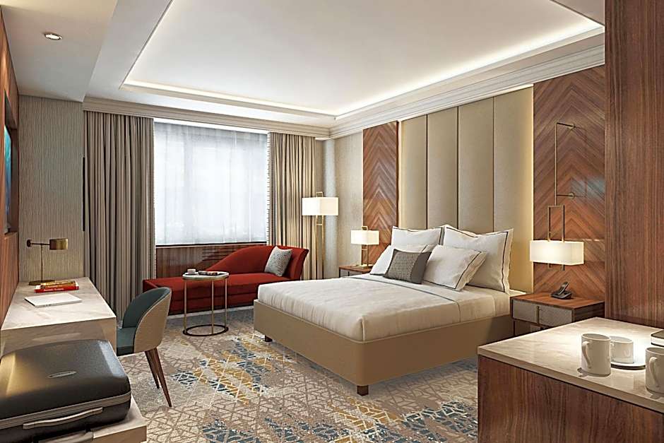 The hotel offers a variety of rooms, including Junior Suites with city views, 1 Bedroom Executive Suites with club lounge access, and Deluxe rooms with city views and either a King bed or Twin beds. The rooms accommodate 2 adults and 1 child, with smoking not allowed in any room. Bed sizes include King beds and Twin beds, with room sizes ranging from 323 sqft to 592 sqft.