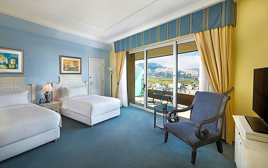 There are multiple room types available at Hilton Beirut Habtoor Grand Hotel. These include Deluxe King Room with Balcony (quadruple occupancy), King Royal Master Room (triple occupancy), Double or Twin Room with View (twin occupancy), Executive Twin Room with Executive Lounge Access (twin occupancy), Ambassador Suite with Executive Lounge Access (suite), Royal Suite with Executive Lounge Access (suite), King Room with Balcony (triple occupancy), and Executive King Room with Executive Lounge Access (triple occupancy). Smoking is not allowed in any of the rooms. The bed sizes vary between King, Queen, and Twin beds.