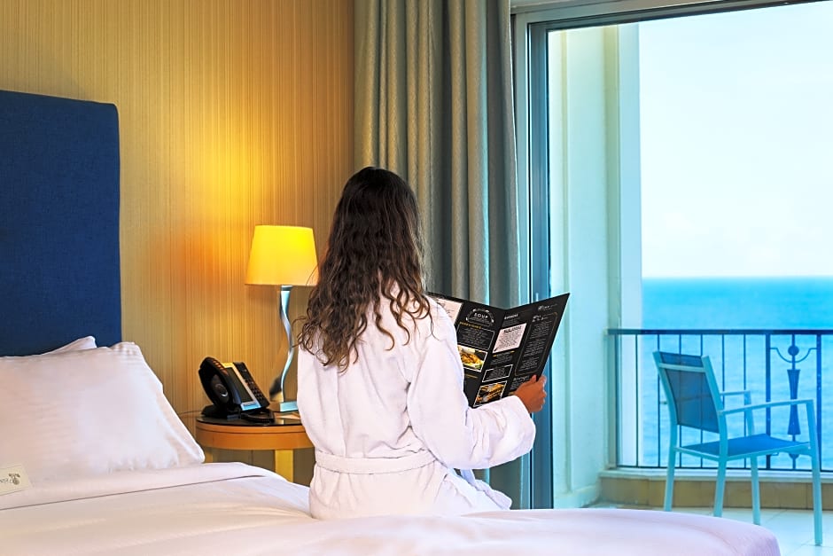 This 27 square yards’ double room encompasses a one bedroom (1 king size bed or 2 twin beds), one bathroom and a balcony with unlimited view over the Mediterranean Sea, Beirut’s Lighthouse and the Beach Lounge.