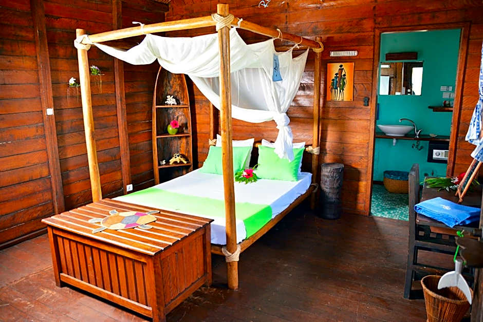 These beach-front bungalows overlook the Indian Ocean. Built with local architecture and design, each bungalow is equipped with a mosquito net, a bathroom, a desk, and a terrace.
