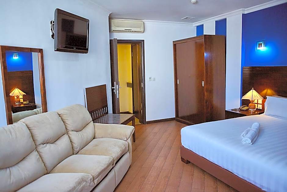 The hotel offers a Triple Room accommodating 3 adults with 1 Twin bed and 1 Queen size bed, a Double Room for 2 adults with 1 Queen size bed, and a Double or Twin Room for 2 adults with 2 Twin beds. Smoking is not allowed in any of these rooms. Additionally, there is a Family Suite with 4 Queen size beds, accommodating 2 adults and 2 children, covering a larger area of 560 sqft.