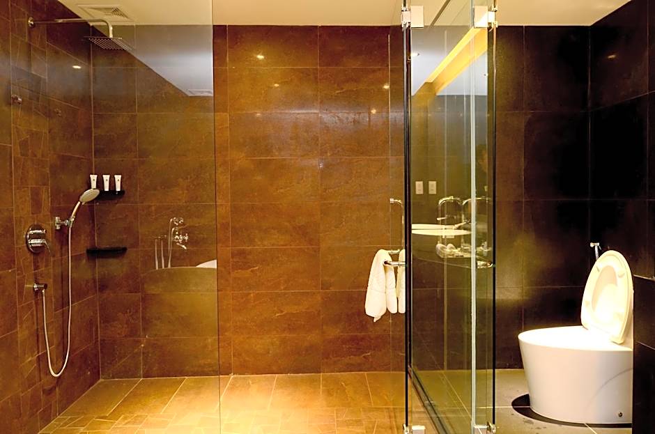 A spacious and elegant suite featuring an private bathroom with a bathtub, a flat-screen TV and warm lighting.