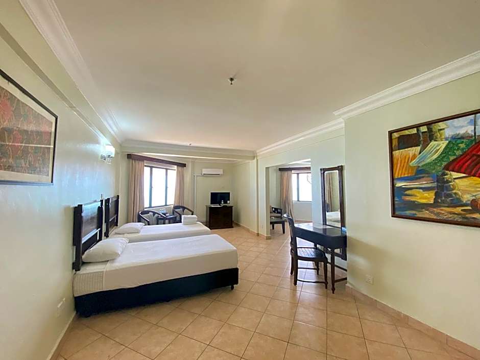 This spacious air-conditioned family room opens up to views of the sea. It is fitted with with a satellite TV, a mini fridge and tea/coffee making facilities. The private bathroom includes shower facilities.