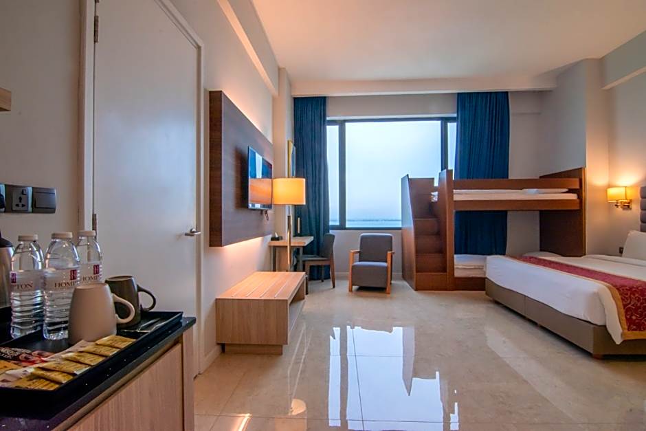 The types of rooms available at Hompton Hotel by the Beach include Family rooms, Suites, and TwinDouble rooms. Family rooms can accommodate 4 adults and 1 child, while Suites and TwinDouble rooms can accommodate 2 adults and 1 child. Smoking is not allowed in any of the rooms. Bed sizes vary and include King size beds, Bunk beds, and Twin beds.