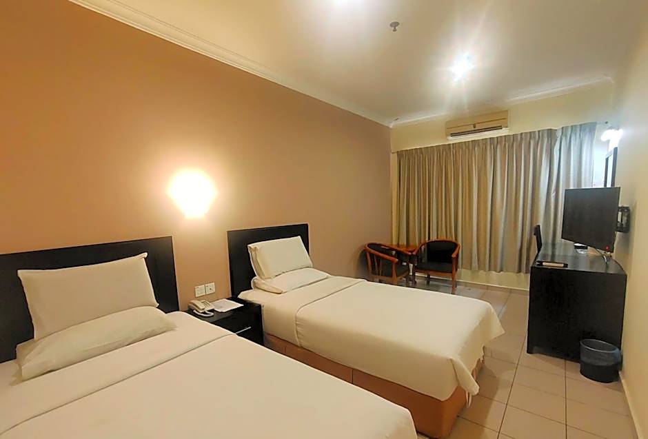 The Megah D'Aru Hotel offers Family Rooms accommodating 3 adults and 1 child with 1 Twin bed and 1 Double bed, Standard Twin Rooms accommodating 2 adults and 1 child with 2 Twin beds, and Standard Double Rooms accommodating 2 adults and 1 child with 1 Queen bed. All rooms have a size of 280 sqft and do not allow smoking.