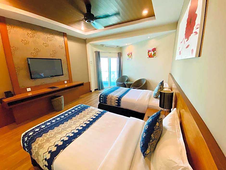 The Langkawi Seaview Hotel offers a variety of room types. The Premier Deluxe Room accommodates 2 adults and 1 child with a King size bed. The Family Room with Balcony is suitable for 4 adults and 1 child, featuring 2 King size beds. The Suite is designed for 2 adults and 1 child, with a King size bed. Additionally, the hotel offers a Superior Double Room with a King size bed for 2 adults and 1 child, and a Superior Twin Room with 2 Twin beds for 2 adults. All rooms are non-smoking and have a size of 269 sqft, except for the Suite which is 377 sqft.