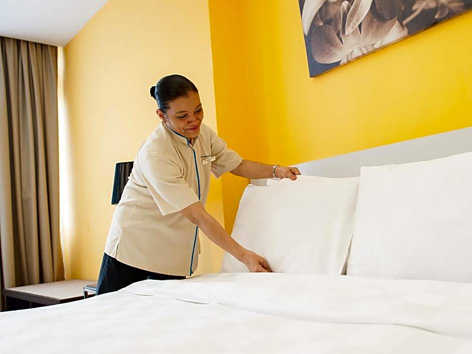 An outdoor pool scene awaits, with a free outdoor pool and a free kids’ pool for young travelers to splash around. The sun deck is perfect for lazy afternoons, and elevators ensure easy access to the upper levels.