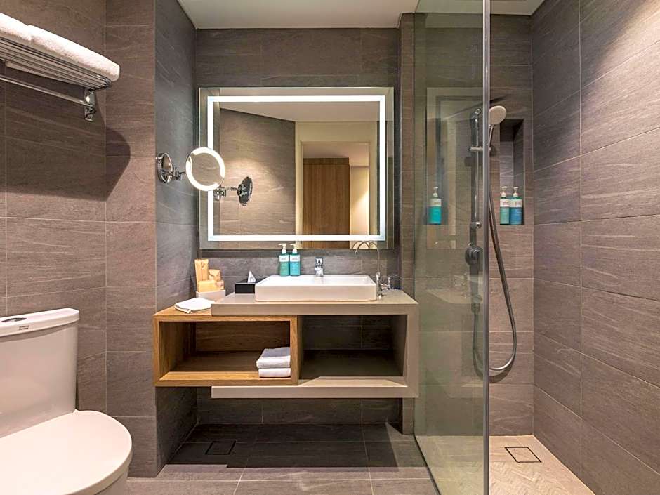 Our Deluxe Room features a modern interior and a LIVE N DREAM king-sized bed, ideal for 2 adults and a child sharing the bed. Enjoy amenities such as an ergonomic desk, a 55'' LED TV, and a cozy couch. Some rooms lack a couch due to space limitations.