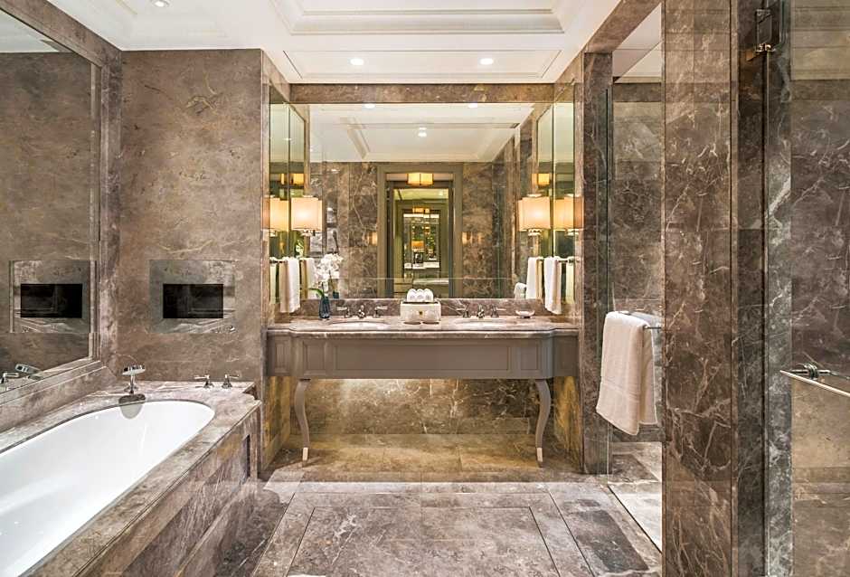 This room has a seating area and study desk. A separate walk-in wardrobe with its in-built luggage rack and vanity table are also provided. The private bathroom comes with a separate shower, bathtub, toilet, and a double sink vanity complete with beveled mirrors.