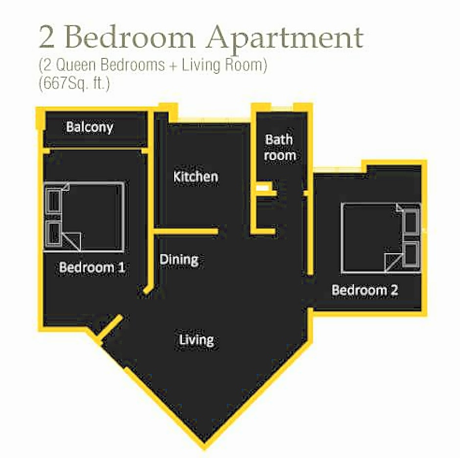 A broad range of layouts caters to both solo travelers and groups. For example, Studio Apartment (312 sqft) accommodates 2 adults and 1 child with 1 x Double bed and 2 x Twin beds, while larger options include the Duplex Apartment (969 sqft) for up to 10 adults and 6 children, featuring 2 x Twin beds and 1 x Queen size bed. Other configurations span the Suite, 2 Bedroom, 3 Bedroom, Apartment options, and the Family Suite, providing spaces from intimate to expansive.