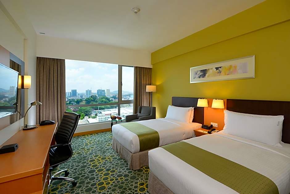 The Holiday Inn Melaka offers a variety of rooms including twin rooms, double rooms, triple rooms, and suites. The rooms range in size from 344 sqft to 667 sqft. All rooms are non-smoking and can accommodate up to 3 adults and 2 children, except for the Kids Suite which can accommodate 3 adults and 3 children. The beds in the rooms include twin beds, double beds, and king-size beds. Some rooms also have lounge access.