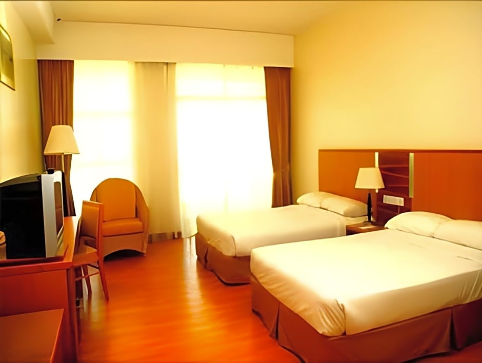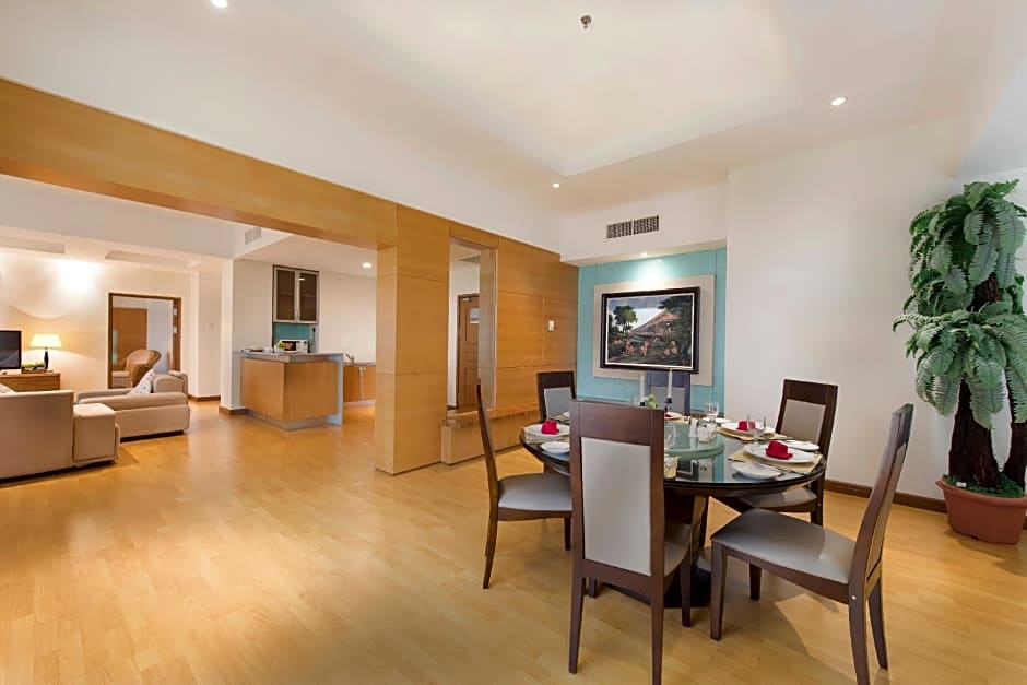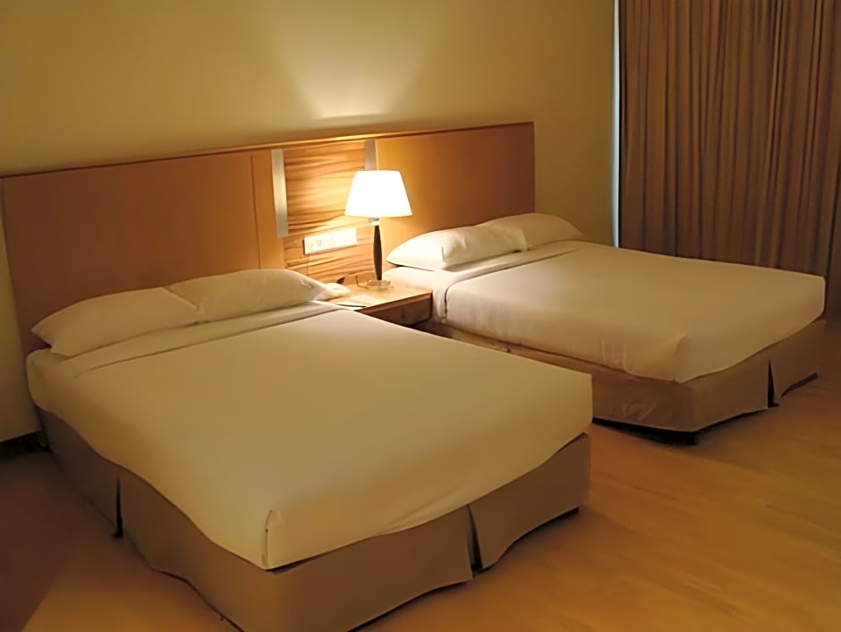 Room options include Deluxe Room with two beds, or Deluxe Room with two twin beds; both non-smoking and accommodating 2 adults and 1 child. Also available are Superior Rooms (with two beds or two twin beds), Junior Suite, Presidential Suite, and Executive Suite, all non-smoking and designed to welcome two adults and one child.
