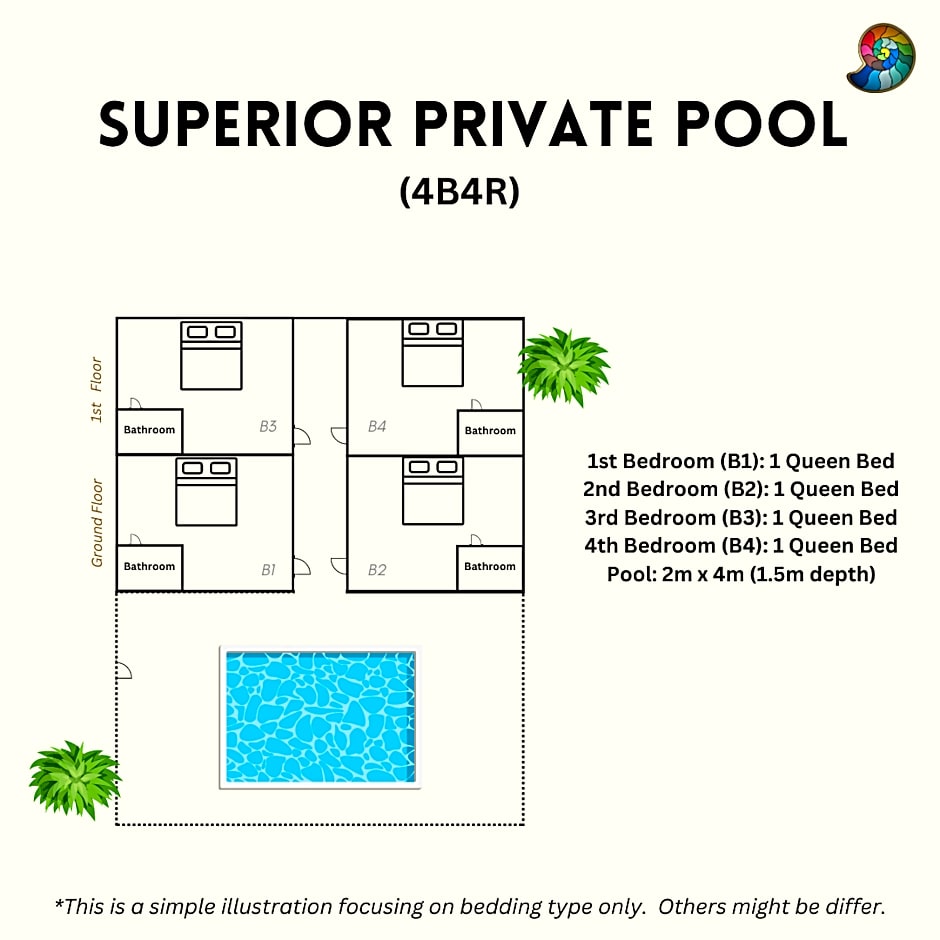Guests will have a special experience as the family room offers a private pool. The family room provides air conditioning, a private entrance, as well as a private bathroom featuring a shower and a bidet. This family room features a TV. The unit offers 4 beds.