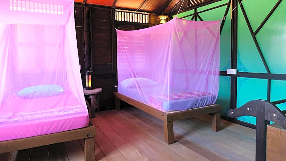A range of room types is available, including Deluxe Bungalow with Garden View (king-size bed, accommodates 2 adults and 1 child) and Deluxe Double Room (queen-size bed). Other options include Economy, 1 Bed (queen-size bed), Economy, 2 Twin (two twin beds), and Dormitory, Single, plus Chalet and Family layouts, with several configurations to suit different needs. Only cash is accepted for payment.