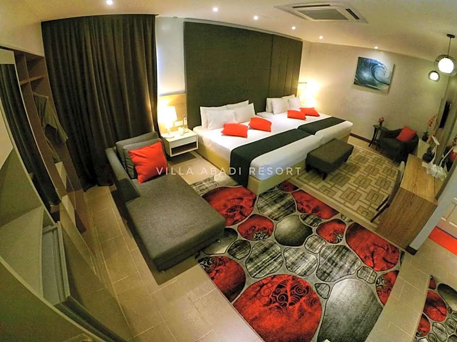 Villa Abadi Resort offers a variety of room types including Standard Twin, Deluxe Double, Deluxe King, Standard Double, Deluxe King Suite, and Deluxe Twin. None of the rooms allow smoking. Occupancy for all rooms is 2 adults, except for the Deluxe King Suite which can accommodate 2 adults and 1 child. Bed sizes range from Twin to Queen to King, depending on the room type. Room sizes vary from 205 sqft to 420 sqft.