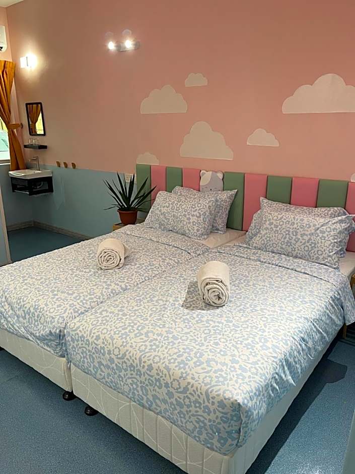 Kids friendly - has slides in the room & big slide in lobby Rooftop chilling place, we had a breakfast up there enjoying the view Has laundry & dryer, free to use Wide bathroom Near town & mosque