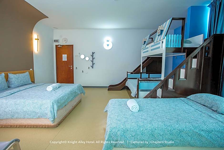 The Knight Alley Hotel offers a Family Room with a private bathroom that accommodates up to 5 adults and features a double bed and a bunk bed. They also have a Double or Twin Room with a private bathroom that accommodates 2 adults and has twin beds and a queen size bed. Additionally, they have a Triple Room with a private bathroom that accommodates 3 adults and offers twin beds and a queen size bed. All rooms are non-smoking.