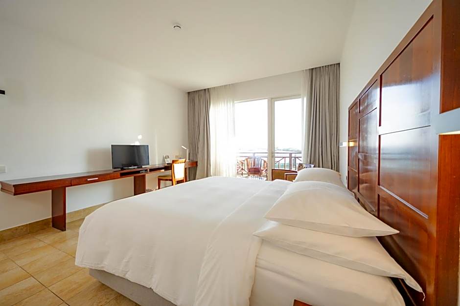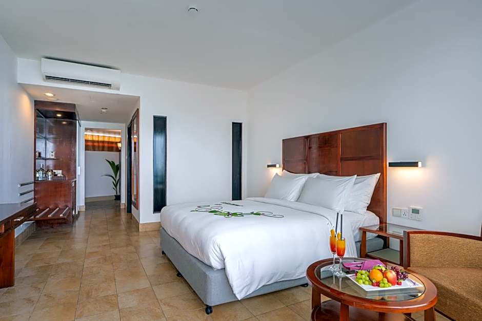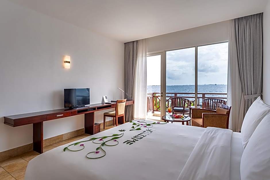 Features flat-screen TV and private balcony with view of the Indian Ocean.