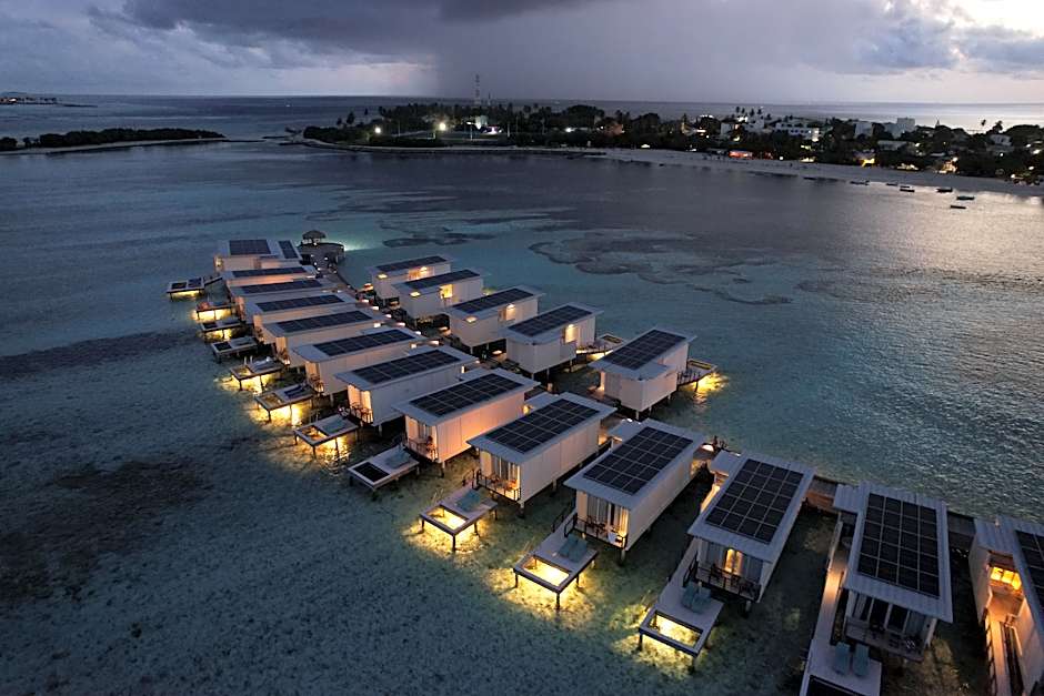 These overwater villas overlook clear waters, coral and marine life. It features a private sundeck, a partially submerged hammock and a large living area. The large open-plan bathroom offers an outdoor shower and bathtub with stunning views.