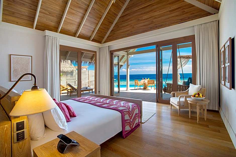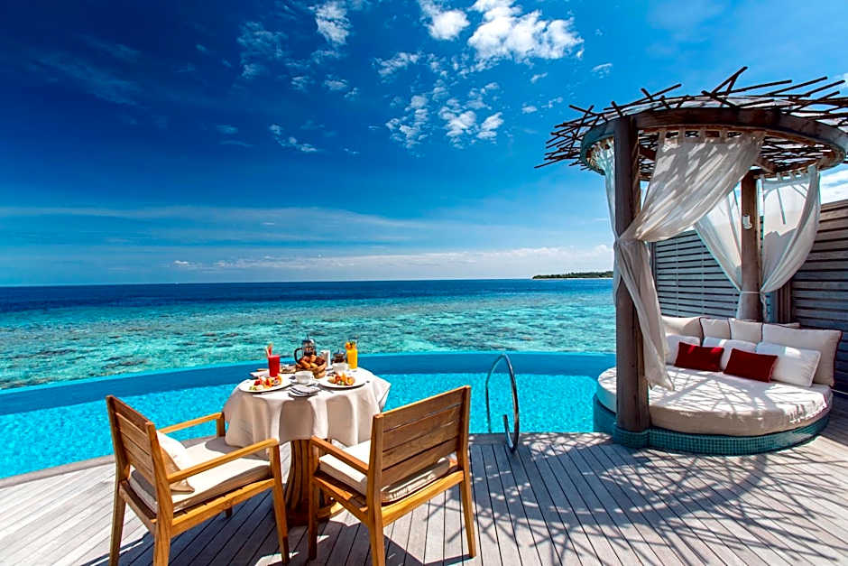 On the stilts over the ocean, these villas open to a sundeck, a private pool, Maldivian-style swing chair and sunloungers. The private bathroom has a bathtub with ocean view while the rainshower offers views of the sea below.