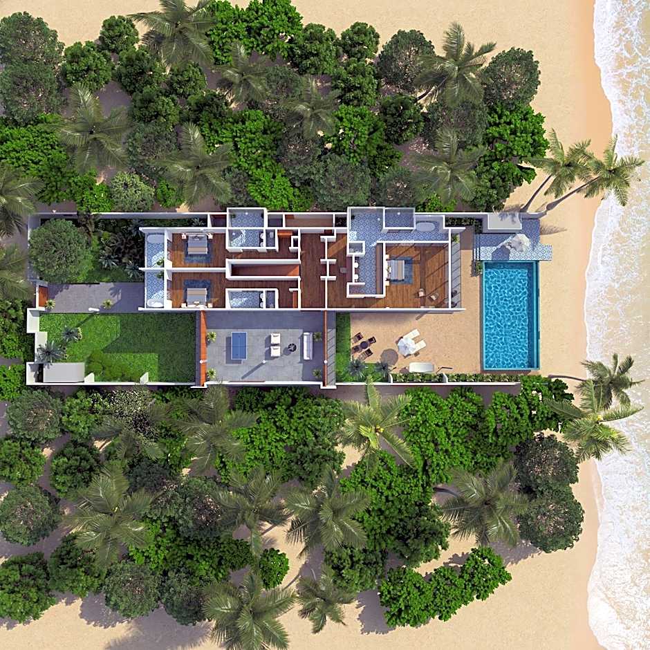 The villa has 2 separate air-conditioned bedrooms with 2 bathrooms offering direct access to the beach and ocean. It also features an outdoor shower.