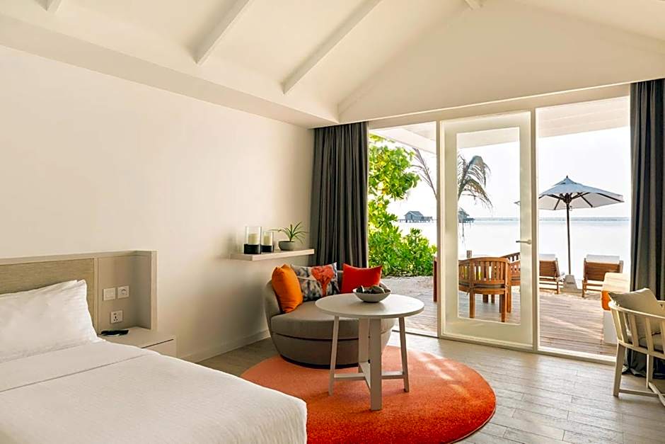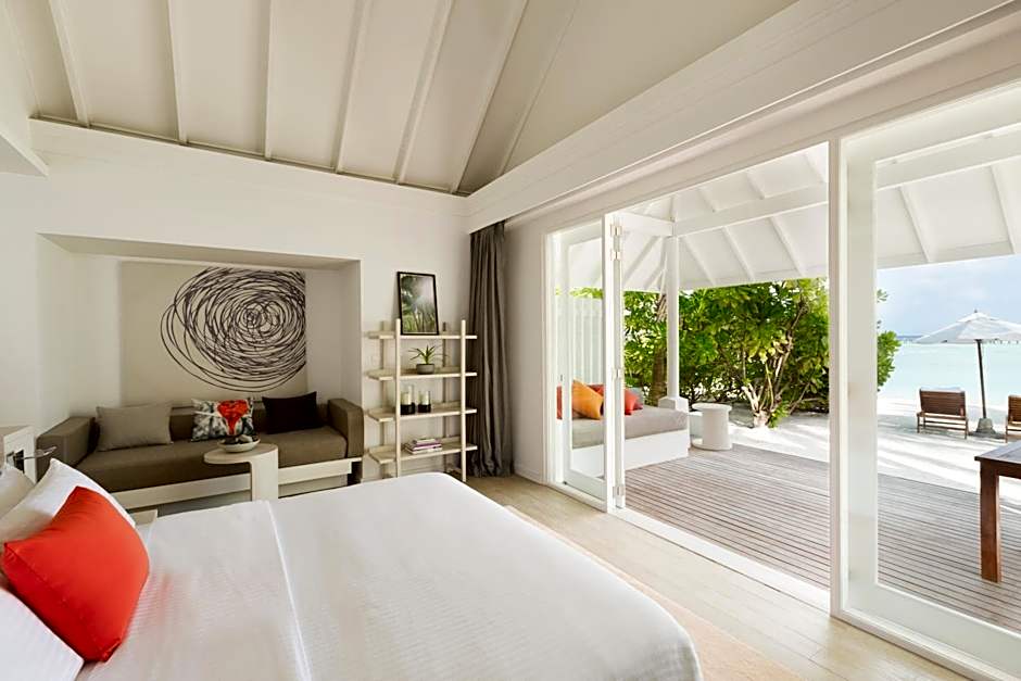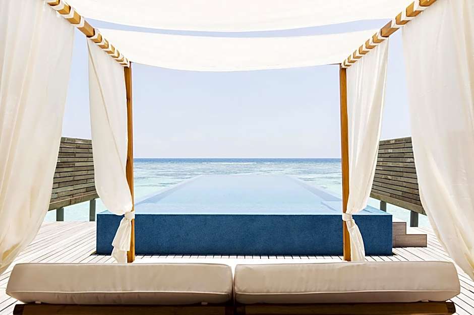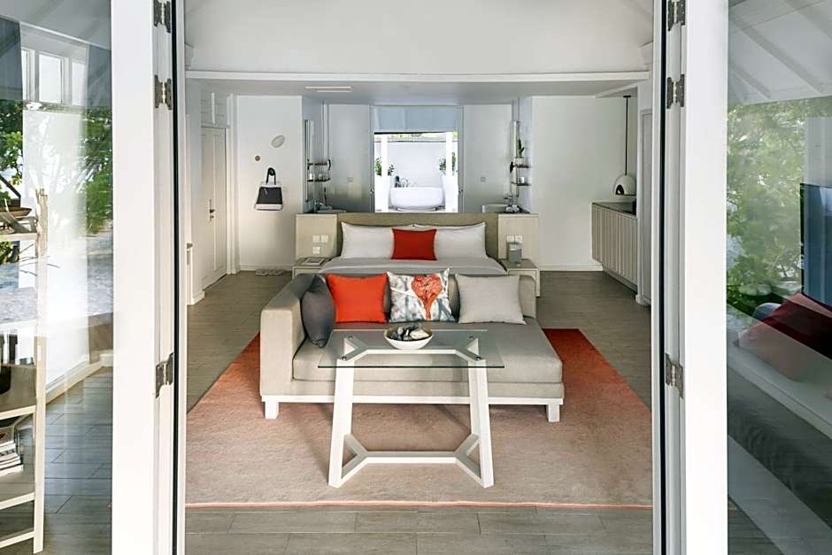 The Water villa of 322 ft² comes with an outdoor deck with sunbeds and a staircase leading to the ocean. It is located on the sunset side of the island and has a Catamaran net over the lagoon to laze in, glass floor window.