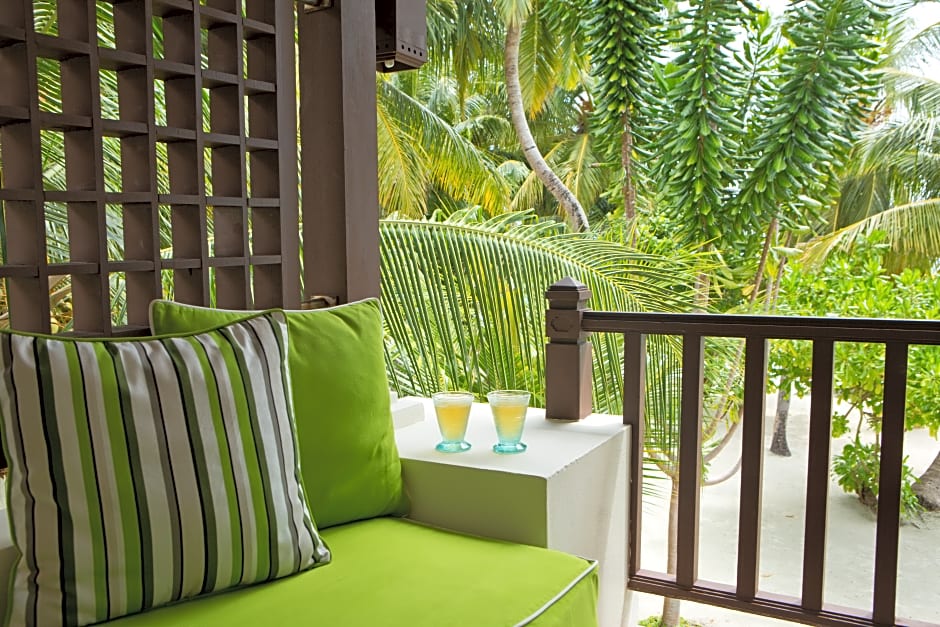 Spacious villas feature a large bedroom, sitting room and veranda that lead onto the white sands. A private courtyard features a swimming pool/spa bath, set in a peaceful garden with a thatched roof daybed pavilion for relaxation and sun loungers.