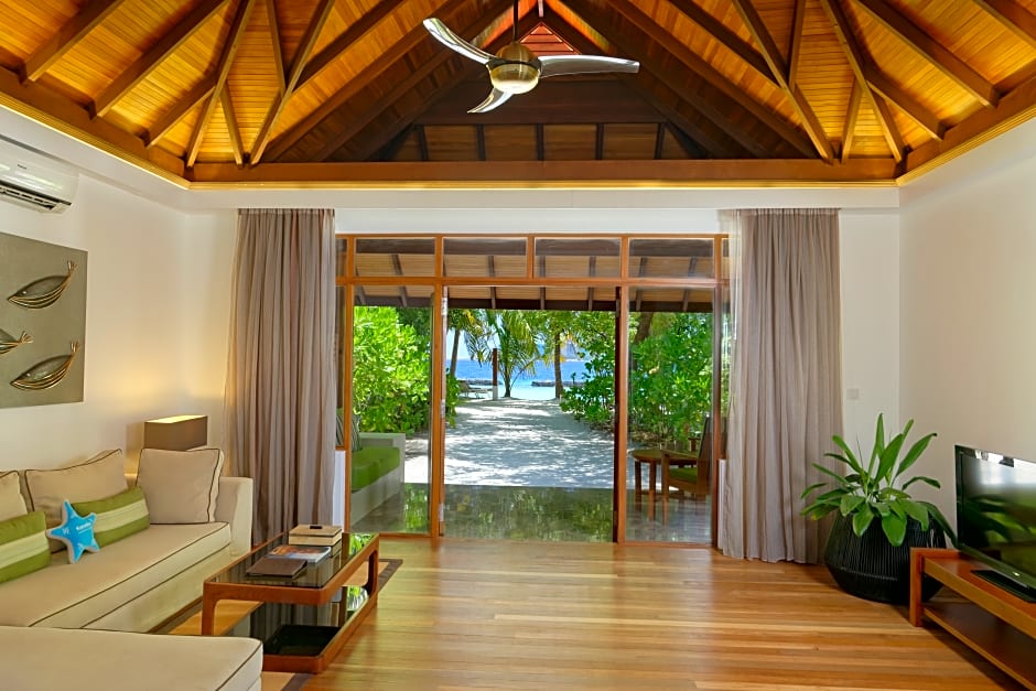 Spacious villa located on beachfront featuring a large bedroom, adjoining seating room and veranda. It comes with a spacious bathroom, indoor and outdoor shower, bathtub and open courtyard complete with a rainshower and an intimate outdoor garden spa bath.