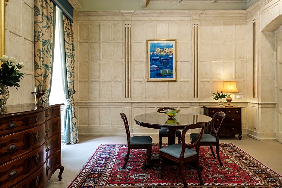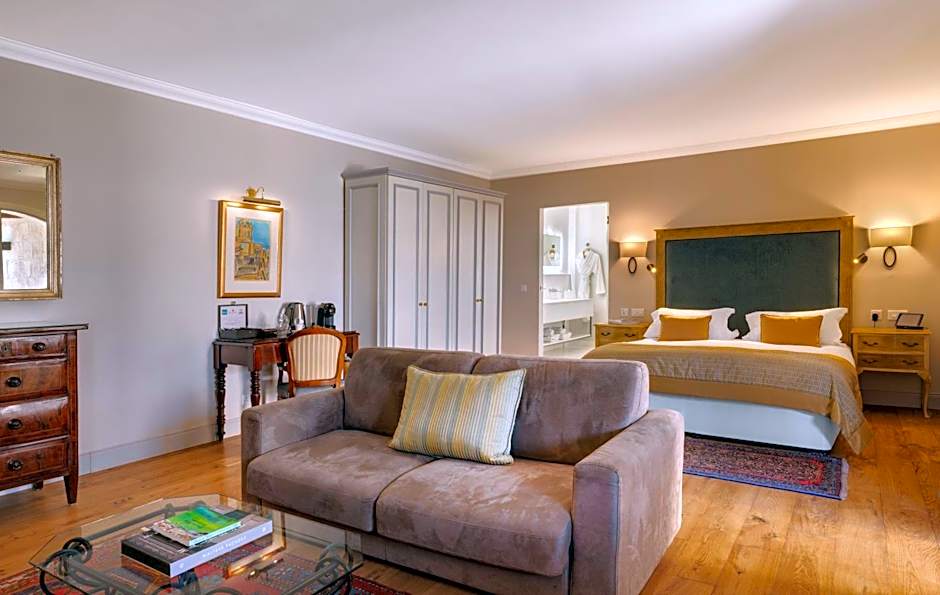 Split level large suite with Balcony overlooking the Vilhena Palace, a medieval court of law is decorated with antique furniture and artwork, French fabrics and Persian rugs and features a fully fitted marble bathroom.