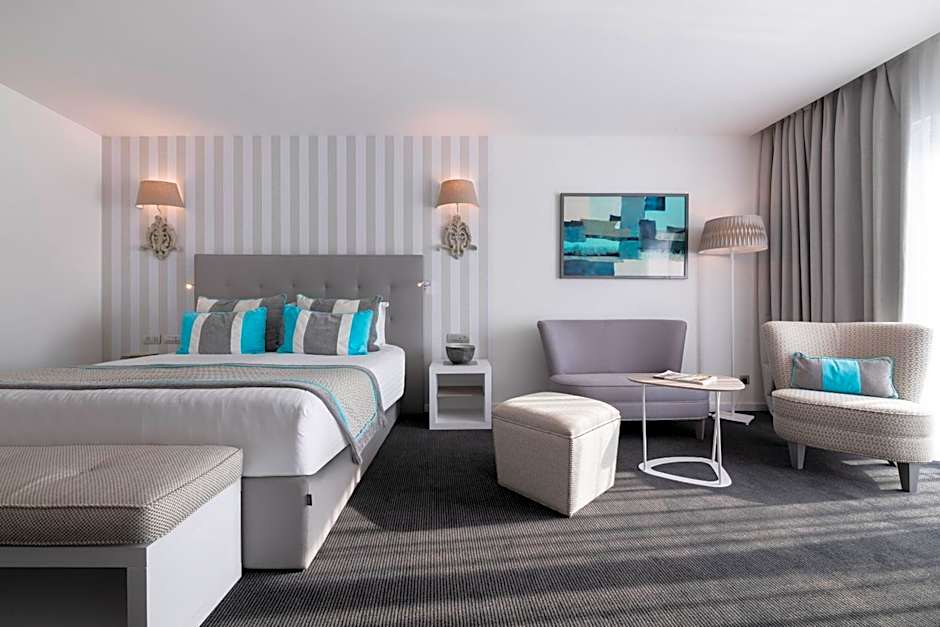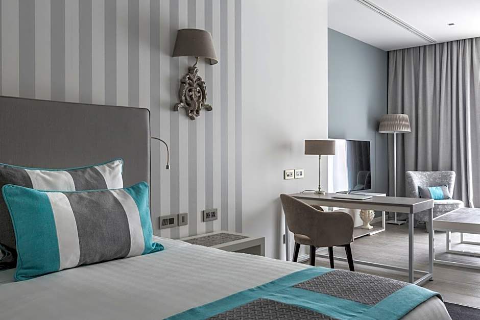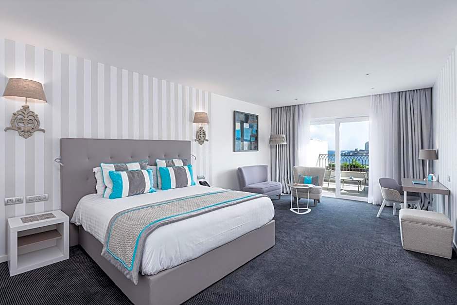 The Junior Suites at Hotel Juliani in Malta offer spacious elegance with modern decor, premium bedding, a stylish bathroom, and a comfortable living area. Enjoy high-speed Wi-Fi, a large flat-screen TV, and stunning sea views for a truly luxurious stay.