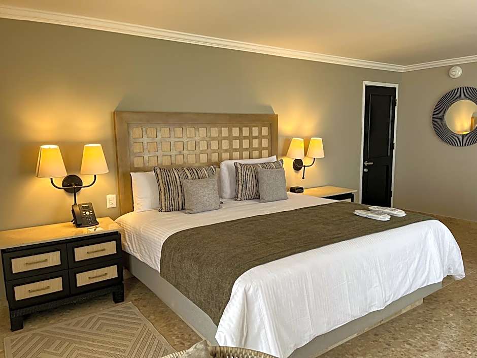 The hotel offers a variety of room types including Suites and Doubles. Suite rooms are available in three variations: Perla Junior Suite Golf View, Piramide Junior Suite Ocean View, and Piramide Junior Suite Golf View. Double rooms are available in various types such as Princesa Ocean View, Piramide Golf View with Two Double Beds, Princesa with King Bed, and Piramide Ocean View with King Bed. The occupancy for the rooms ranges from 2 adults to 4 adults, with bed sizes including Queen and Double.