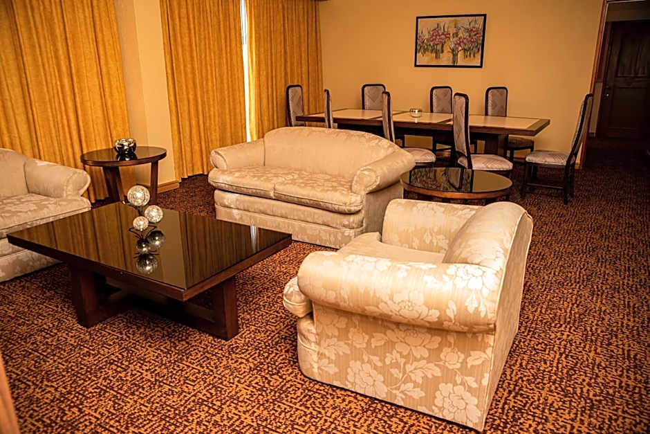 This spacious suite features a balcony overlooking the hotel gardens. It has a room with 2 double beds, a room with a queen-size bed and a living area. There is also a dining area and 3 bathrooms.