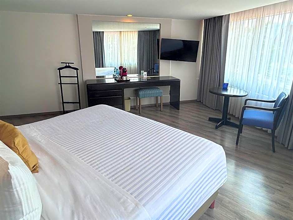 The hotel sits right in the middle of a small park, so it was surrounded by threes and a calm atmosphere. It has its private parking and it is always monitored. One of the rooms we were assigned to had an amazing 180° view of the city and nearby hills. This room was a bit chilly but heating worked just fine. The other room was always incredibly warm and cozy. There was a fair nearby but it wasn't a problem in any way. In each floor there are cookies and coffee for the grabs and on our floor we also had a communal puzzle. The hotel has a restaurant, a bar and an open air terrace, all offer good service and food in generous quantities, prices are also decent. There was a pool, but Morelia can get cold in winter, so maybe better leave it for the summer. The area is well located, incredibly safe, quiet, and there are at least 2 shopping centers (restaurants, bars, super, coffe shops, banks) just around the corner. The city center is like 15 to 20 min by cab, but we preferred to remain in the premises, which was incredible. Correlation price-value was definitely worth it. Good for family trips and to have a good rest.