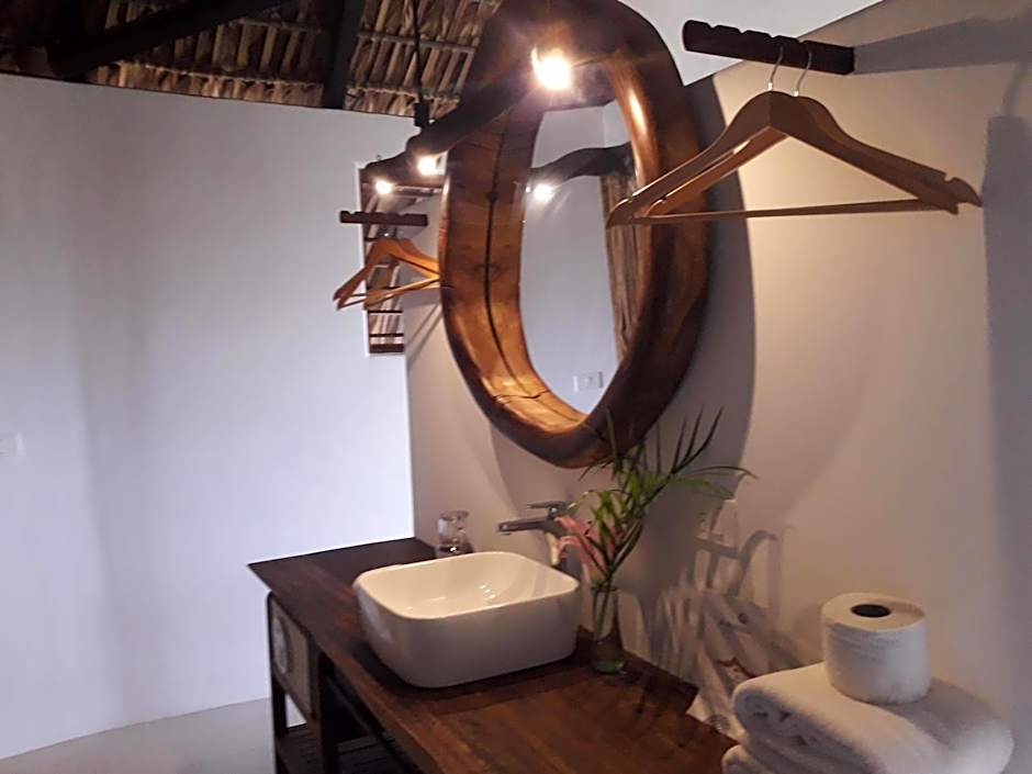 This room has a Queen-size bed, with mosquito net, and a safety box. The bathroom has hot water and a terrace. Is equipped with a hammock and reclining chairs.