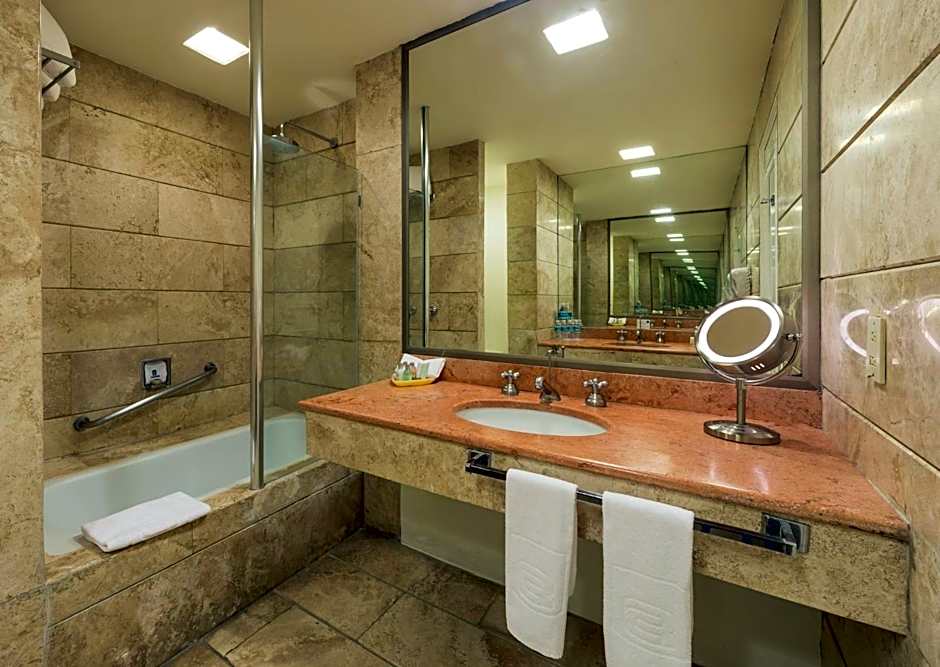 This air-conditioned room has a furnished balcony with views of the bay and the ocean. The marble bathroom has 2 sinks and a bath tub with shower head. The room also has a ceiling fan.
