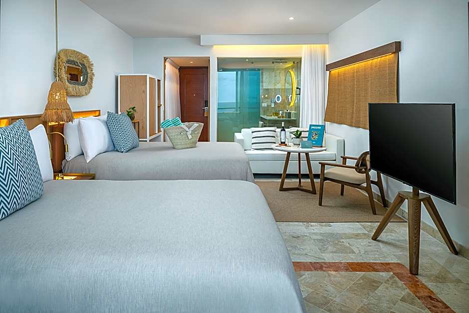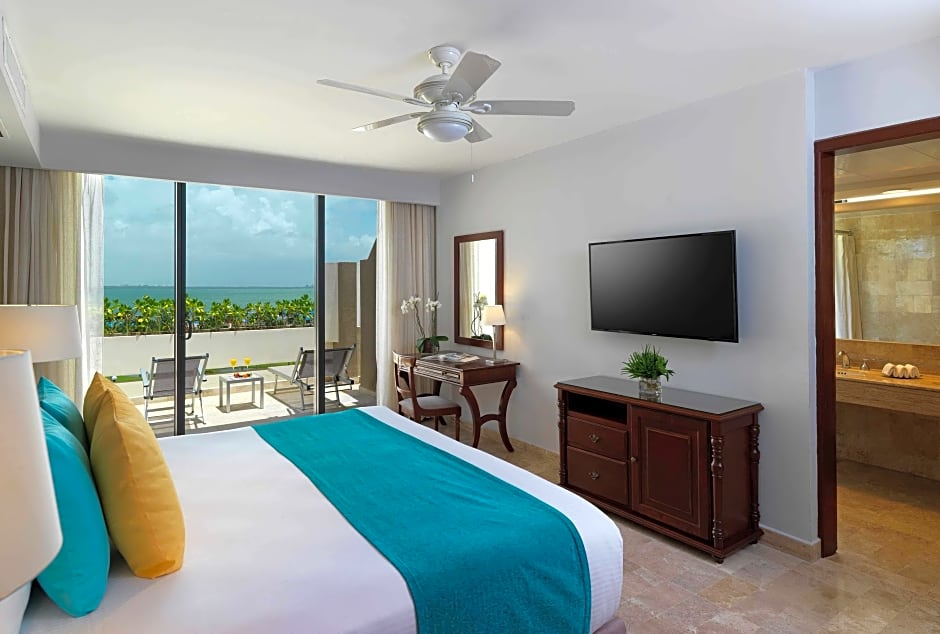 This spacious junior suite features designer furniture, a private terrace with views of the Nichupté Lagoon. Plus luxury amenities are available.