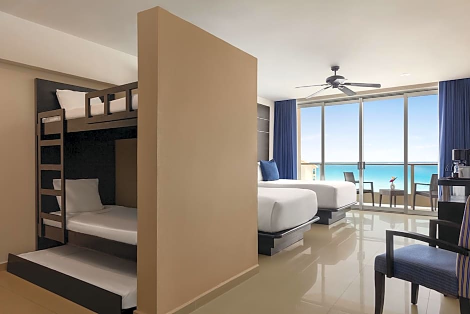 This room provides a partial ocean view with a balcony, king size & bunk beds, bathroom with shower, mini-fridge, electronic safe deposit box, air-conditioning, 50´´ flat screen television with cable service, telephone, hair dryer, iron and ironing board, 24 hours Room Service, Nonsmoking room.