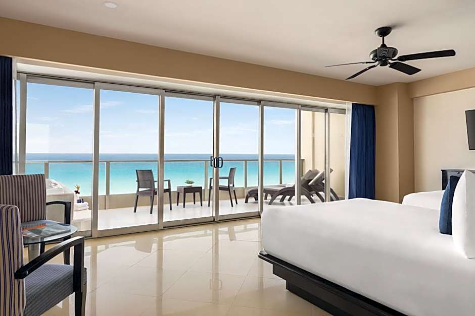 This room provides partial ocean view with a balcony with two double beds, bathroom with shower, Jacuzzi inside the room, mini-bar, coffee machine, electronic safe deposit box, air-conditioning, 50´´ flat screen television with cable service, telephone, hair dryer, iron and ironing board, 24 hours Room Service, Nonsmoking room.