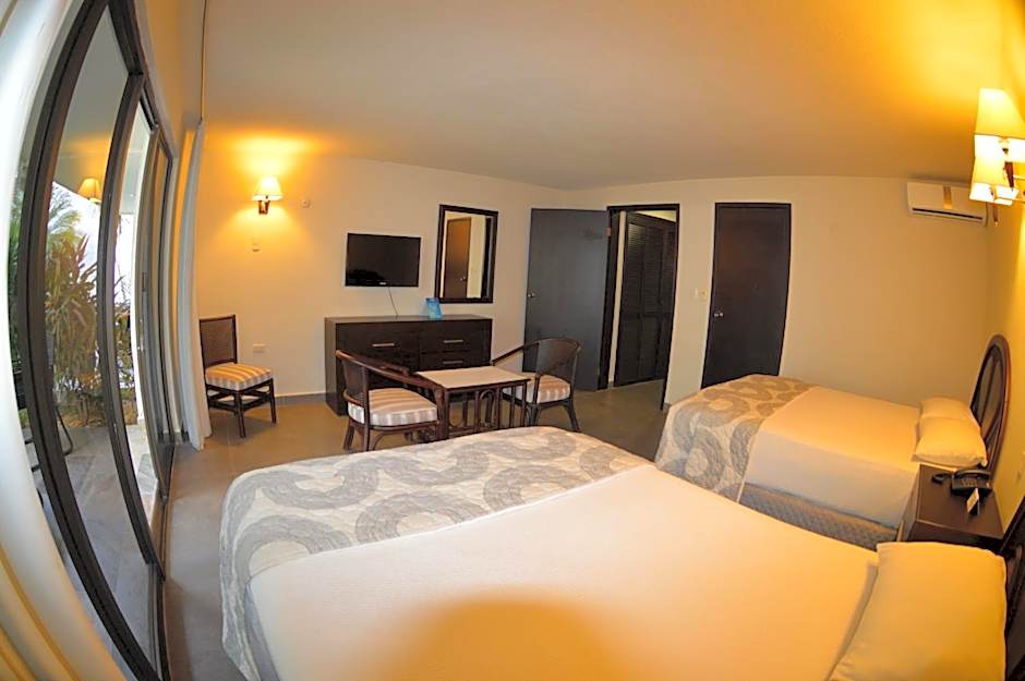 With two double beds,streaming channels,telephone services ($) ,air conditioning with individual control, sofa, dining table, ceiling fan, kitchenette, crockery, microwave, coffee maker ,one bathroom with shower amenities, safety deposit box in room and Wi- fi. The maximum accommodations for up to 3 adults and are located on the ground floor or first floor with garden view. Location or view is not guarantee this is subject to availability upon arrival.