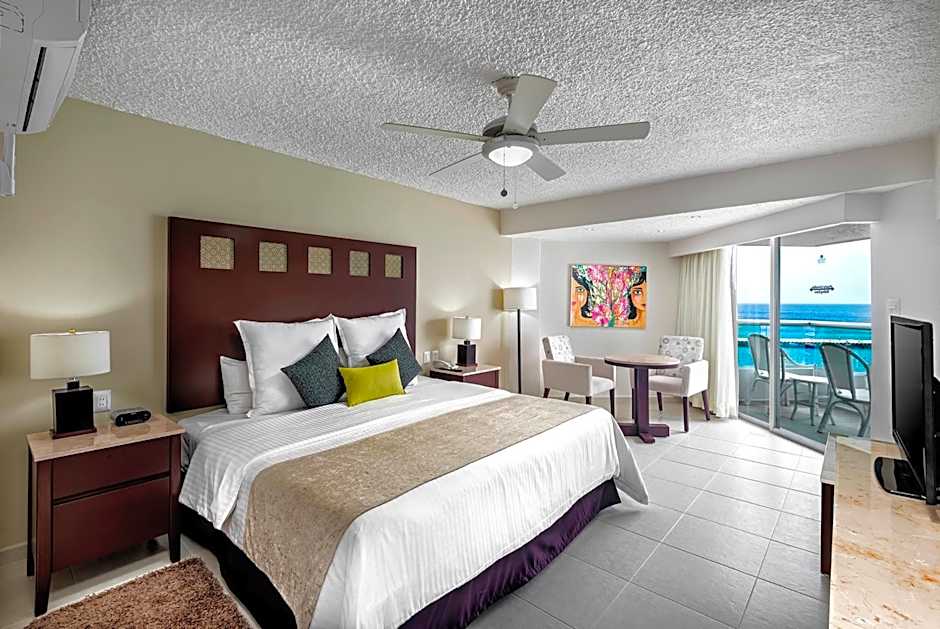 This suite features a bedroom with a king-size bed and a lounge with a queen-size Murphy bed. The kitchenette includes a microwave and coffee maker, and there is satellite TV and a safe. The private balcony or patio offers great views of the Caribbean Sea.