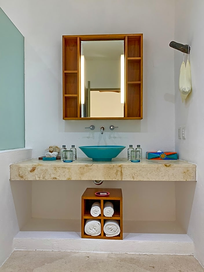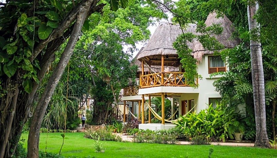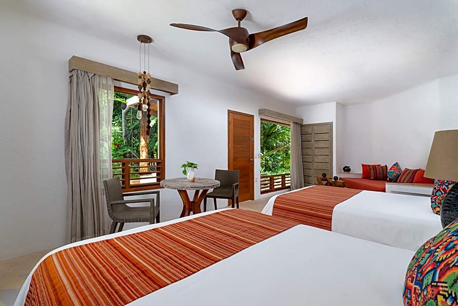 Nestled amongst the most beautiful tropical garden in the resort, and abounding with nature, these rooms are on the ground floor of a two-unit Casita and are amongst the resort’s largest garden view rooms. They feature a private terrace with two hammocks, sprawling bathrooms with ceramic turquoise double sinks, and in many cases adjoining outdoor showers, and are surrounded by multiple water features and a serene fountain-lined pool. These large rooms have living areas with a convertible day bed and dining area. All rooms offer handcrafted bedding accents, ceiling fans, and individual A/C control. These rooms have a King bed or 2 queen beds and are close to the fitness center, Revive Spa and Fuego Restaurante y Cantina and a short stroll to the resort's palm lined beach. Tree house Rooms are also the most convenient to 5th Avenue for those who want to venture out into downtown Playa del Carmen.
