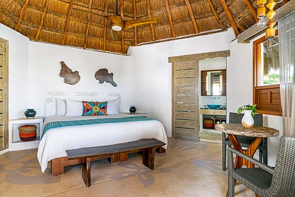 This bungalow features air conditioning, seating area and organic amenities. A hammock is featured to relax and enjoy the oceanfront view. A mini bar, coffeemaker, a safe box and a private bathroom with a hairdryer are provided.