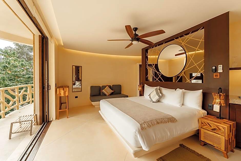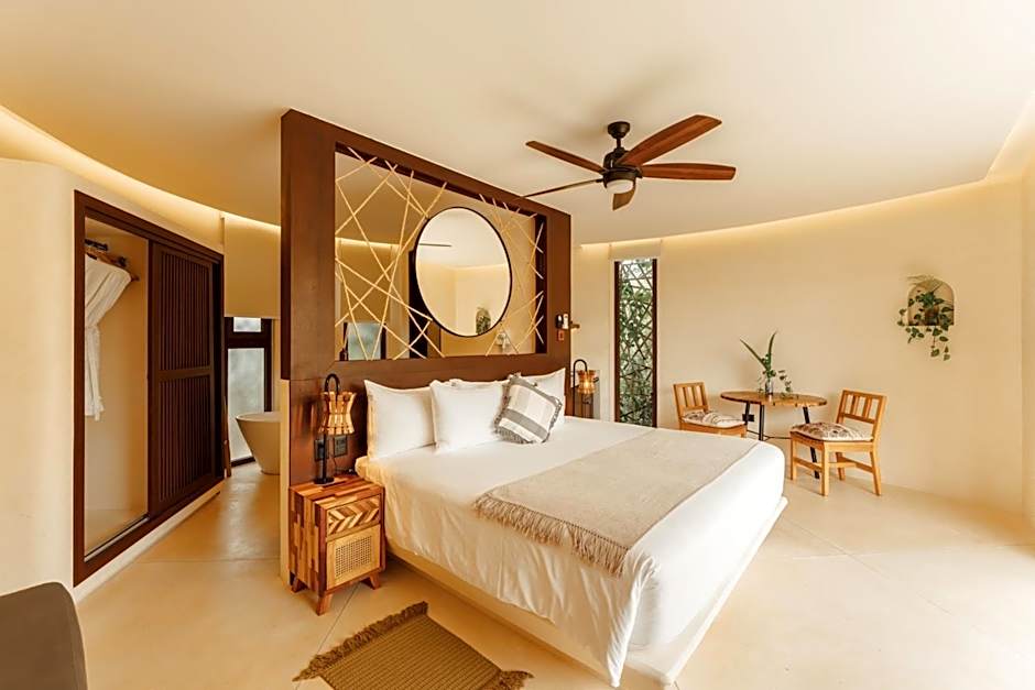 At Kan Tulum hotel, there are two types of rooms available. The Deluxe King Studio rooms are studios with a size of 420 sqft. These rooms have a non-smoking policy and accommodate 2 adults with a king-size bed. There is also a Deluxe King Studio Infinity Pool option, which offers the same features and accommodations but includes access to an infinity pool.