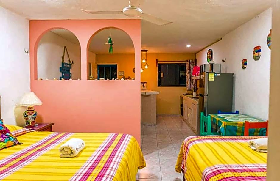 Nice big room. Comfortable bed. Kitchen was good. We cooked a lot of meals. If we needed anything extra the staff were happy to supply it from the communal kitchen. Pool area was well maintained lots of places to sit both there and on the upstairs terrace. Lovely mexican style decoration. Location was just a 5 minute walk to the beach. Another 5 minutes along the beach one way is the Posieden statue and 5 minutes the other way to the Malecon via the walkway. There were a few restaurants on this side of the wharf but the majority are along the Malecon. It's surrounded by typical local homes so not in the main tourist area. But we felt safe at all times. The staff were great.