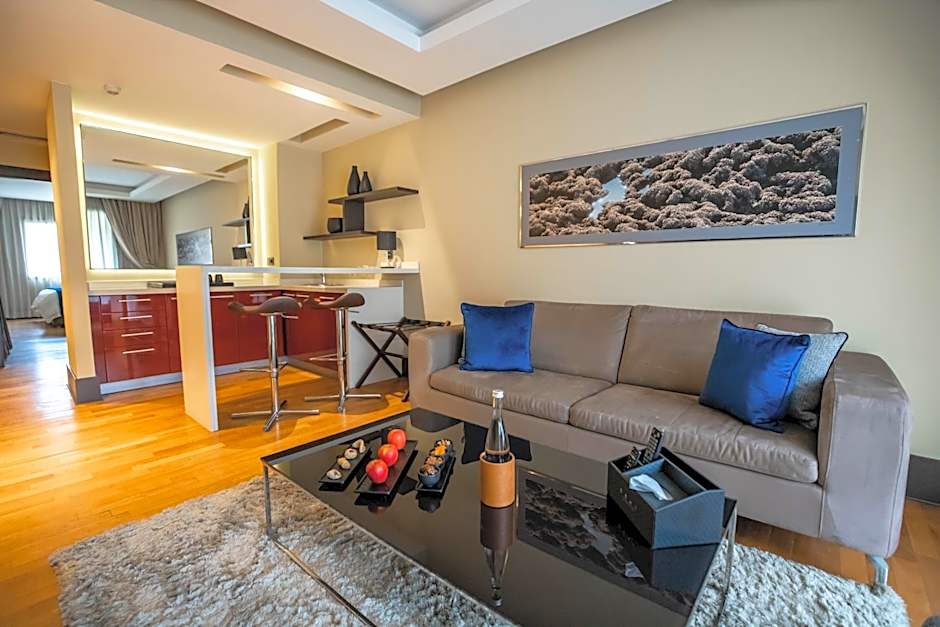 This spacious, modern suite includes: -living room -private bathroom -balcony -flat-screen TV with satellite channels. -iPod docking station -CD and DVD player -free Wi-Fi connection -electronic key card -mini-bar